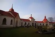 Around the church is built a ring cloister divided into ten sections by five chapels and five gates all this on a circular ground plan. Roof of each chapel originally culminated into five Pylons. These pointed to the meaning of light and symbolized eternity. The cloister along with chapels was a place where pilgrims prayed and also hid when the weather turned bad. Not only the church itself but also its surrounding – cloister with chapels – illustrates Santini's great architectonic and creative potency.