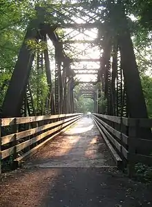 After a series of reorganizations, the railroad along Pine Creek became a part of the New York Central Railroad and eventually Conrail. Freight and passenger service continued until 1988, when Conrail ended rail service. The tracks were removed, and the first section of the Pine Creek Rail Trail opened in 1996.[4] The trail opened in stages with the most recent section (from Ansonia to just north of Wellsboro) being completed in 2007.[5] The trail is operated by the Pennsylvania Department of Conservation and Natural Resources.