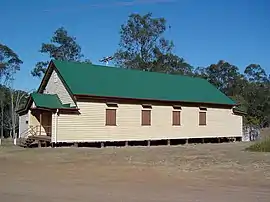 The Congregational Church commenced services at Pine Mountain circa 1863.[9] In May 1873 a Congregational Chapel was erected on a 3.5-acre (1.4 ha) site with a chapel that was relocated from Bremer Mills (at Bundamba).[10] This chapel was used to house a provisional school under teacher Mr Bryce with an enrolment of 50 to 60 children and an average attendance of about 30 children.[11]
