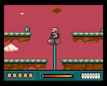 Pinkie is a side-scrolling platform game with puzzle elements reminiscent of Super Mario World and James Pond 3 in which the player assumes the role of Pinkie, who is tasked with collecting dinosaur eggs through the galaxy to prevent their extinction.[1][2][3][4][5] The player controls Pinkie and his "Pinkie Pod" vehicle across 50 levels featuring their own variety of enemies and obstacles divided into five planets, each one represented by an overworld map that expands after completing a level.[2][3][4][5] Pinkie must collect two out of three eggs placed on pre-determined spots in order to complete a level.[1][2][4][5]