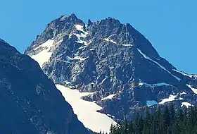Pinnacle Peak is a 7,360+ ft (2,240+ m) mountain summit in the North Cascades Range of Washington, United States.[3] It is located within North Cascades National Park, between Pyramid Peak and Paul Bunyans Stump, which is the nearest higher peak. It rises steeply from Diablo Lake, one of the reservoirs on the Skagit River. It is part of a group of peaks that form the northern end of a chain running south through climbing destinations such as Colonial Peak and Snowfield Peak. Like many North Cascade peaks, Pinnacle Peak is more notable for its large, steep rise above local terrain than for its absolute elevation. Precipitation runoff from the mountain drains into Diablo Lake and Skagit River. The approach is via the Pyramid Lake Trail, starting near Diablo Dam on the North Cascades Highway. From the lake, there is route-finding up Pyramid Arm to Colonial Glacier.