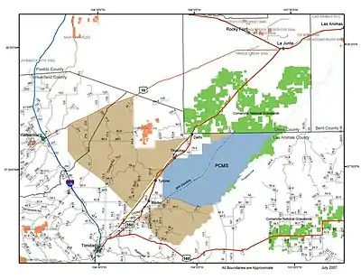 PCMS is located northeast of Trinidad, Colorado, and is part of Las Animas County, Colorado. It borders on Comanche National Grassland to its north. The Purgatoire River, locally known as the Picketwire, is its eastern boundary. Elevations on Site range from 4,300 to 5,800 feet (1,311 to 1,768 m) The Site has a semi-arid, steppe climate. Annual precipitation is 12 to 16 inches (305–406 mm). The terrain of PCMS is flat to rolling and dotted with small, rocky hills and mesas. The Purgatoire River flows in a 300–400 feet deep canyon and its tributaries have cut steep arroyos into the terrain. Vegetation is mostly shortgrass prairie mixed with pinyon and juniper trees.[1]