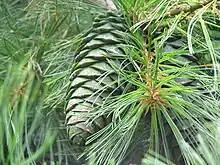 Individuals on average reach a height of 20 m (65.61 ft.) tall, and around 100 cm (3.28 ft.) dbh. Branches and branchlets spread out in a wide, horizontal manner. Needles are in fascicles of 5, and are a bright green color. Cones are 10-20 cm (3.93-7.87 in.) long, reddish brown to brown, and 8 cm (3.14 in.) in diameter. Seeds are 8-12 mm (0.31-0.47 in.) long, wingless, and of an ovoid shape.[2]