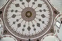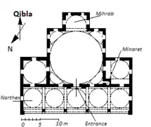 The mosque is situated in the middle of a courtyard on a terrace.[1][2] Built in ashlar,[2] it has a square plan form topped with a lead-sheet covered dome of 11.90 m (39.0 ft) diameter. It has two lines of windows, the upper line windows are in pointed arch form and the ones below have rectangular form. The mihrab, situated in a stem, which is topped by a half dome, opens to the main prayer room by a large pointed arch. On two sides of the main prayer room, there are two domed cells, which have doors to the outside and the inside. Both cells have a window opening to the outside in the south, and a window opening to the narthex in the north.[2] The mosque features a narthex with five pointed-arch spacings in front of the main entrance. The five domes of the narthex are carried by four columns with muqarnas capitals. The middle narthex dome is higher than the others. The narthex is flanked by walls with a window on both sides.[2] The interior of the domes, arches, walls and particularly around the windows are decorated with hand-drawn figures. The interior of the main dome features the Quran vers ʾĀyat al-Kursī ("The Throne Verse"). The mosque has one minaret with a single balcony in the northwest, which is accessible from th mosque's inside. The minaret's base is original while the tower was re-built during the renovation works of the mosque complex, which were commissioned by the trustee Sâdeddin Bey and took place 1179 AH (1765–66), according to an inscription situated on both sides of the main gate.. In the middle of the courtyard, there is an octagonal shadirvan with pyramidal roof covered by zinc sheet. It was built during the restoration works of 1966–1971.[2]
