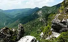 ![]() View from Black Mountain Trail in Pisgah National Forest. Mountain bikers take a break near the summit of Black Mountain. |