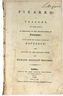 Pizarro is a 1799 historical tragedy by Richard Brinsley Sheridan. It was inspired by August von Kotzebue's play Die Spanier in Peru, based on the Spanish conquest of the Inca Empire in 1532 by Francisco Pizarro. It premiered at the Theatre Royal, Drury Lane in London on 24 May 1799.[1]