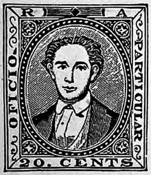 Back in Spain, at the end of 1874 Torres opened a shop in Barcelona named Centro General Timbrológico Español. In international dealings he used the name Rosendo Fernández,[14] the name of a business colleague and friend with whom he was later arrested for the Melila affair. He continued to supply philatelic publishers with illustrations of stamps, including John Walter Scott, founder of the Scott catalogue, who published them in the American Journal of Philately. Another of his enterprises during this time was the purchase in 1876 of up to 100,000, by now almost worthless, unused stamps of the defeated Carlist rebels from the Third Carlist War. The stamps were falsely cancelled by Torres to make them more valuable.[15]