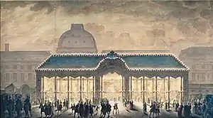 The name "carrousel" refers to a type of military dressage, an equine demonstration now commonly called military drill. The Place du Carrousel was named in 1662, when it was used for such a display by Louis XIV.[1]