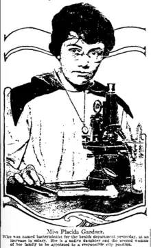 Gardner taught pathology, toxicology, physiology, histology, and chemistry at the University of Southern California.[3] She was also on staff at Los Feliz Hospital. In January 1917 she was appointed to the office of City Bacteriologist[4] with the Health Department of the City of Los Angeles.[5] She and her sister Margaret Gardner (a lawyer) went to France in 1918 with the Stanford Women's Relief Unit,[6] along with Clelia Duel Mosher and others.[7] Placida Gardner supervised sanitary conditions in Red Cross canteens. She described her experiences working with the Red Cross on embarkation at St. Nazaire in an essay for the Stanford Illustrated Review.[8]