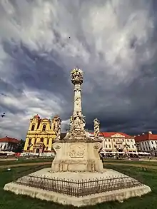 Plague Column (Romanian: Coloana Ciumei; German: Pestsäule), also known as Holy Trinity Monument, is a Baroque monument in Timișoara's Union Square. It was placed in the central square of the city, then known as Domplatz, in 1740 as an ex voto of chamber councilor Johann Anton Deschan von Hansen. The monument belongs to the typology of plague columns, widespread in the Baroque era throughout the South German, Bohemian and Hungarian space.