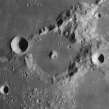 Plana is a lunar impact crater that lies on the boundary between two small lunar mare areas, with Lacus Mortis to the north and the larger Lacus Somniorum on the southern side. It was named after Italian astronomer Giovanni Antonio Amedeo Plana.[1] It is joined to the crater Mason to the east by a short stretch of rugged ground. Due north of Plana in the midst of the Lacus Mortis is the prominent crater Bürg.