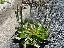 Plantago subnuda is a species of plantain known by the common name tall coastal plantain. It is native to western North America from the west coast of the United States to west-central Mexico, where it grows in wet and moist habitat types, often in coastal areas, such as marshland. It is a perennial herb producing few oval leaves around a thick caudex. The broad smooth-edged or slightly toothed leaves may be up to 40 centimeters long. The stemlike inflorescences grow erect to a maximum height near half a meter. Atop the peduncle of the inflorescence is a dense cylindrical spike of many tiny flowers. Each flower has a corolla of ephemeral petals about 3 millimeters long.