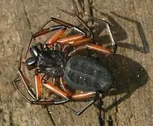 The common name scorpion spider is derived from its distinctive flat back and carapace orange colouring.[2] This colouring is evident around the mouthpiece and on the anterior aspects of the legs.[2] These similar features of the genus Platyoides in comparison to a scorpion is often why this genus is referred to as the scorpion spider.[2]