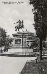 The monumental statue in the center of the plaza, dedicated to president Gerardo Barrios, was made by Francisco Durini and inaugurated in 1909. The project for the monument was conceived by brothers Antonio and Carlos Ezeta, with participation of educator Rafael Reyes.[1] The statue, cast in bronze, shows an equestrian statue of the military leader. The statue is placed on a pedestal of granite that shows battle scenes cast in bronze and the coat of arms of El Salvador.