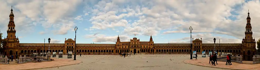 The Plaza de España ("Spain Square", in English) is a plaza in the Parque de María Luisa (Maria Luisa Park), in Seville, Spain. It was built in 1928 for the Ibero-American Exposition of 1929. It is a landmark example of Regionalism Architecture, mixing elements of the Baroque Revival, Renaissance Revival and Moorish Revival (Neo-Mudéjar) styles of Spanish architecture.[1]