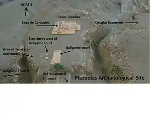 Plazuelas was built over three hill sides, divided by two ravines, overlooking a large valley to the south.[1]
