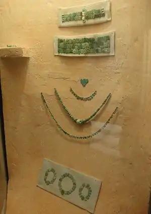 It was a high valued stone for jewels manufacturing, it was associated with water and the morning sky. Many pieces were found with various designs, among them are miniature figures (measuring about 3 mm or 1/8 of an inch), shaped as water droplets, lightning and dogs, animals associated with water.