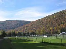 The Plunketts Creek valley looking southwest, with the Northcentral State Game Farm pheasant enclosures. Coal Mine Hollow in Cove Mountain is at left.