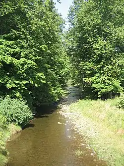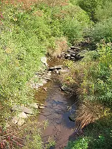 The clear-cutting of forests in the 19th century adversely affected the ecology of the Plunketts Creek watershed and its water quality.[32] Polluting industries on the creek and its tributaries then included a coal mine and tannery (which are long since departed).[6][33] In the autumn of 1897, three men working with hides at the Proctor tannery were stricken with anthrax, two fatally. Another four deaths originally blamed on pneumonia were suspected of being due to pulmonary anthrax, and some cattle drinking from Plunketts Creek downstream from the tannery were also infected.[34] As late as 1959, the sludge pile from the tannery was still visible in Proctor, but was not disturbed for fear of anthrax spores.[35] No acid mine drainage is reported in the watershed.