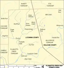 The Plunketts Creek watershed drains parts of Cascade, McNett, and Plunketts Creek townships in Lycoming County, and Fox and Hillsgrove Townships in Sullivan County (with most of the watershed in Plunketts Creek Township). The drainage basin area is 23.6 square miles (61 km2), accounting for 4.78% of the 494 square miles (1,280 km2) Loyalsock Creek watershed.[5] Bear Creek, whose mouth is also within the village of Barbours but on the opposite (left) bank, is the nearest major creek at 0.52 miles (0.84 km) downstream, as measured along Loyalsock Creek. (It is also known as "Big Bear Creek" as it is the watershed upstream of "Little Bear Creek".) The neighboring major watersheds on the same bank are Wallis Run (9.56 miles (15.39 km) downstream) and Mill Creek (at the village of Hillsgrove, 9.16 miles (14.74 km) upstream).[5] Pleasant Stream, a tributary of Lycoming Creek, is the watershed to the north.[3]