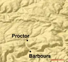 In 1868, Proctor was built as a company town in the midst of the timber required for the tannery (Barbours had initially been considered for the site). The second village on Plunketts Creek was originally named "Proctorville" for Thomas E. Proctor of Boston, who produced leather for the soles of shoes there. Proctor was brought to the area by William Stone of Standing Stone Township in Bradford County, who knew the area was "one vast tract of hemlock timber".[44] The Proctor tannery employed "several hundred" at wages between 50 cents and $1.75 a day, the employees living in one hundred twenty company houses, each renting for $2 a month.[6][35][44] Hemlock bark, used in the tanning process, was hauled to the tannery from up to 8 miles (13 km) away in both summer and winter, using wagons and sleds. The hides which were tanned to make leather came from the United States, and as far away as Mexico, Argentina, and China.[45] In 1892, Proctor had a barber shop, two blacksmiths, cigar stand, I.O.O.F hall, leather shop, news stand, a post office (established in 1885), a two-room school, two stores, and a wagon shop.[6][35] Finished sole leather was hauled by horse-drawn wagon south about 8 miles (13 km) to Little Bear Creek, where it was exchanged for "green" hides and other supplies brought north from Montoursville.[35]