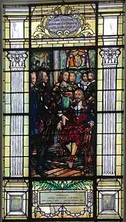 In 1907–09, the church installed stained-glass windows by the noted J&R Lamb Studios.[59][60] This studio opened it doors in 1857 and is now the oldest existing studio of its kind in the US.[61][62] The windows in Plymouth Church are unique in that they do not depict any biblical scenes. Instead they focus on the history of democracy in England and the US, with a particular emphasis on the influence of the Puritans, Pilgrims and Congregational Churches.[63][64] In 1913 the family of John Arbuckle,[65] a coffee merchant, donated money to create a large garden and the Classic revival parish house. The house and arcade which adjoin the building were designed by Woodruff Leeming.[1][2]