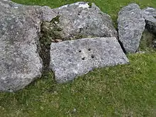 A sleeper block near King's Tor - ↑ The original Act had stated that the northern terminus was to be at Bachelor's Hall, an agricultural store built by Tyrwhitt. The Hall is still in existence: it is about 1 km east of Princetown, but it is at a considerably lower altitude; in fact an incline on a gradient of 1 in 8 would probably have been required to reach it. It appears that this aspiration was quietly dropped. An 1850 map reproduced by Kingdom in The Princetown Branch indicates a mine at this location, and Harris refers to it as a small-scale tin mine.[13]