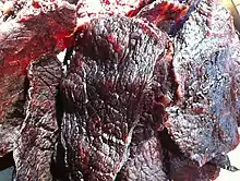 Po (Korean: 포) is thin strips or sheets of dried meat and fish used in Korean cuisine.[1] Po, which is made from meats including beef, pork, venison and poultry; and seafoods including whitefish, eel, squid, octopus, shrimp and crab; is eaten as snack food, banchan (food accompanying bap) or anju (food accompanying sul).[1][2] Po is prepared for traditional occasions such as pyebaek (formal greetings from the newlyweds after the wedding ceremony) and jesa (ancestral rite).[3][4]