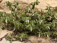 Golden drop flourishes on hard rock outcrops, especially in garrigue terrain. In Wadi Khureitun (Judea), it grows in small vertical cracks and holes alongside Sonchus suberosus and Centaurea eryngioides, while in Wadi Qelt (Judea) it is found growing along the narrowest part of the chasm.[2] In Jordan, it is found in Wadi Zerka Main (Moab) on the hard limestone.[2]