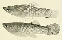 P. vivipara belongs to the Poecilia subgenus of the genus Poecilia[3] and is the type species of the genus.[4] The species most closely related to it are P. parae and P. picta, which belong to the Micropoecilia subgenus.[3]