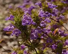 This annual herb produces an erect stem reaching 30 centimeters in maximum height. Its herbage is strongly aromatic and coated very thinly with stiff hairs, or lacking hairs. The inflorescence is an interrupted series of flower clusters. The flowers are just over a centimeter long, bell-shaped with narrow throats, and bright purple in color, usually with some white on the lower lip.