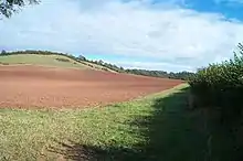 The Poldens are a low narrow ridge of late Triassic / early Jurassic mudstones (often referred to as clay) alternating with limestones. The south-southwest facing scarp is formed by a succession of rocks, lowermost of which are the mudstones of the Mercia Mudstone Group (formerly known as the Keuper Marl), overlain in the west by more mudstones of the late Triassic age Blue Anchor Formation (formerly ‘Tea Green Marls’), a thin unit recorded from Puriton Hill east to the vicinity of Stawell. Elsewhere the overlying layer is that of the late Triassic (Rhaetian) age Westbury Formation (formerly known as the Rhaetic clays or Westbury Beds) consisting of mudstones and limestones. Stratigraphically above these are the mudstones and limestones of the Blue Lias, forming the north-northeasterly directed dip-slope of these hills. Blue Lias is believed to have been quarried on the Polden Hills in the 15th century; and was quarried in Puriton from the early 19th century until the 1973, when the local cement works closed.[3] The outcrop is intersected by two sets of normal faults aligned roughly WSW-ENE and WNW-ESE. At the east end of the range, Dundon Hill forms an outlier of the higher formations. The low ground to both north and south is covered by thick alluvial deposits and peat.[4][5][6]