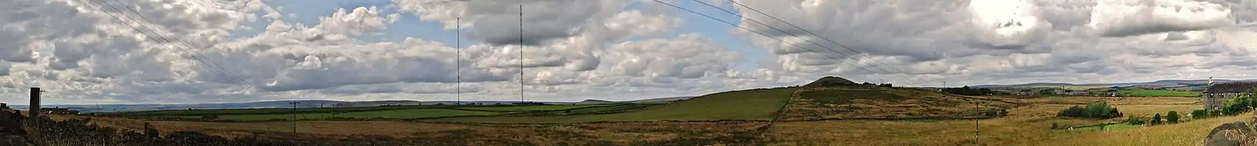Scammonden Reservoir in the Deanhead Valley is to the west, the M62 motorway passes to the north and to the south 700 feet (210 m) below Moorside Edge is Slaithwaite in the Colne Valley. Moorside Edge medium wave radio transmitter's antenna are located at 340 metres (1,120 ft) OD on the moor.[3] An old bridle way passed over the moor to Scammonden at Worts Hill to the west.[4]