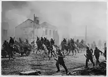 The origin of the photograph was clarified after it was noticed that some of the buildings, uniforms and saddles in the photo match buildings and equipment of soldiers seen in the 1941 German propaganda movie Kampfgeschwader Lützow.[14] The Polish soldiers in Kampfgeschwader Lützow were played by Slovaks and their uniforms and saddles closely match those used by the Slovak army at the beginning of WWII.[1][4] The scene of the charge of "Polish cavalry" in the movie was shot around Wyszków in 1940.[15][16] Also, many scenes from the movie were linked to specific locations in that town.[17] The photograph is not a still from the movie, but it was likely taken during its shooting.[1]