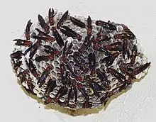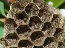 During the springtime, mated foundress wasps emerge from hibernation within cracks of rocky cliff walls. Returning to the area of their natal nests from the previous year, they begin construction of new paper nests typically within a few meters of their natal nests, though generally without reusing the cells of the old nest.[19] A single nest may be built by a group of foundresses, termed "associations", which are usually came from the same natal nest. This group averages at five foundresses though may vary from a single foundress to an association of up to 22 cooperating foundresses.[20] Of this association, a single foundress establishes a dominance hierarchy, with the dominant foundress laying the majority of the eggs.[3][4]