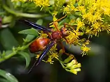 Females of Polistes carolina are usually completely ferruginous (rust in color) with the possibility of black markings forming spots around their eyes, lines on the dorsal surface of the scape, narrow lateral stripes on their scuta, or an incomplete median stripe on their propodea. Bands on sternum 2 or terga 3 and 4 can also be present.[3] Additional very restricted yellow markings can be observed on mandibles, clypei, inner orbits, terga 1, the outer surfaces of the tibiae, and tarsi.[3] Females also have more triangular faces with shorter antennae.[9]