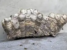 Polistes nests can be built from wood fiber which are collected from posts and plant stems. The fiber is formed into a paper-like comb with hexagonal cells. The nests are orientated downward and are held up by one filament.[12] P. exclamans have also been observed occupying artificial nests put out by researchers and consisting of bundles of straws.[3]