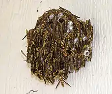 Many Polistes species aggregate over winter. P. exclamans clump in rather large aggregations while hibernating.[23] “These aggregations are frequently found in protected places called hibernacula that can be as varied as crevices and cracks of rocks or trunks, beneath the bark of trees, between walls of buildings, or any other natural or artificial structures that provides protection during hibernation.”[23] Although P. exclamans have been found in organ-pipe muddauber nests, a mud nest that can provide a certain level of protection, it is not thought to actually house hibernating P. exclamans over the winter.[23]