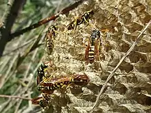 Polistes gallicus is a species of paper wasp found in various parts of Europe, excluding England, Denmark, and Scandinavia, from warmer climates to cooler regions north of the Alps.[1] Nests of these social insects are created in these various conditions. The Polistes species use an oral secretion to construct their nests, which consist of a combination of saliva and chewed plant fibers. This structural mixture physically protects the nest from various harsh elements and from weathering over time.[2]