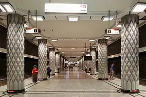 The station is built around a wide, central platform, with exits at both ends of the station. The floor is built in black granite and marble, with white walls and white ceiling supported by two rows of thick, round white marble-clad columns.