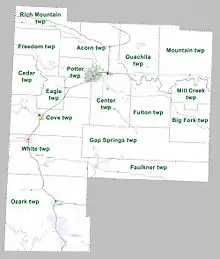 Townships in Arkansas are the divisions of a county. Each township includes unincorporated areas; some may have incorporated cities or towns within part of their boundaries. Arkansas townships have limited purposes in modern times. However, the United States census does list Arkansas population based on townships (sometimes referred to as "county subdivisions" or "minor civil divisions"). Townships are also of value for historical purposes in terms of genealogical research. Each town or city is within one or more townships in an Arkansas county based on census maps and publications. The townships of Polk County are listed below; listed in parentheses are the cities, towns, and/or census-designated places that are fully or partially inside the township. [14][15]