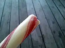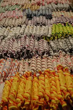 Polkagris (plural: polkagrisar) is a Swedish stick candy that was invented in 1859 by Amalia Eriksson in the town of Gränna, Sweden. It remains a well-known albeit old-fashioned candy in Sweden, often sold at fairs, Christmas markets, and the like. It is still closely associated with Gränna.[1] The traditional polkagris candy stick is white and red, and is peppermint-flavoured.