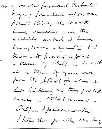 On 29 August 1915, Elgar wrote to Paderewski, asking for permission for the quotation from his Fantasie Polonaise to be published: