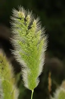 Polypogon monspeliensis, commonly known as annual beard-grass[1] or annual rabbitsfoot grass,[2] is a species of grass. It is native to the Old World, but it can be found today throughout the world as an introduced species and sometimes a noxious weed. It is an annual grass growing to heights between 5 centimeters and one meter. The soft, fluffy inflorescence is a dense, greenish, plumelike panicle, sometimes divided into lobes. The spikelets have long, thin, whitish awns, which give the inflorescence its texture.