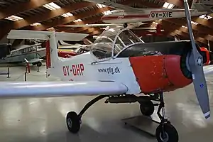 The Polyteknisk Flyvegruppe have used the sole Polyt V to launch their various gliders from 1970 until 2020.[4] OY-DHP is no longer in service, but is on display at the Danish Aircraft Museum, Stauning from summer 2021. Some modifications have been made: the original Polyteknisk designed propeller, optimised for low speed flight has been replaced by a quieter Hoffmann one[4] and the rudder trim tab has been extended to half rudder height.[6] Furthermore the engine cowling has been reshaped and the livery changed from bright orange to a less aggressive white look with orange wingtips, rudder and engine cowling for visibility.