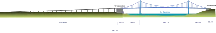 The Pont d'Aquitaine's central span, 393.75 m, is the second largest French suspension bridge behind the Pont de Tancarville, remains a modest work. In 2008, it ranked 80th in the world of suspension bridges. However, it is extended on the left bank by a viaduct of 1014 m, which brings it to the 8th rank in terms of length of French bridges when all categories combined.