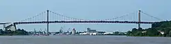 The Pont d'Aquitaine is a large suspension bridge over the Garonne, north-west of the city of Bordeaux, in France. It forms part of the ring-road of Bordeaux and carries the A630 autoroute. It was completed in 1967 and its main span is 394 m (1,293 ft) long.