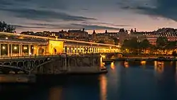 The Pont de Bir-Hakeim (French pronunciation: [pɔ̃ d(ə) biʁ akɛm]; English: Bridge of Bir-Hakeim), formerly the Pont de Passy ([pɔ̃ d(ə) pasi]; Bridge of Passy), is an arch bridge that crosses the Seine in Paris. It connects the 15th and 16th arrondissement, passing through the Île aux Cygnes. The bridge, made of steel, was constructed between 1903 and 1905, in replacement of a footbridge that had been erected in 1878. The bridge has two levels: one for motor vehicles and pedestrians, the other being a viaduct (the Viaduc de Passy) built above the first one, through which passes Line 6 of the Paris Métro. The bridge is 237 metres (777 ft) long and 24.7 metres (81 ft) wide. The part crossing the Grand Bras ('great anabranch') of the Seine (west from the island) is slightly longer than the one crossing the Petit Bras ('small anabranch').[1]