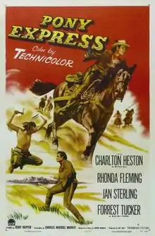 Pony Express is a 1953 American Western film directed by Jerry Hopper, filmed in Kanab, Utah, and starring Charlton Heston as Buffalo Bill, Forrest Tucker as Wild Bill Hickok, Jan Sterling as a Calamity Jane-type character, and Rhonda Fleming.[2] The story is largely based on the 1925 silent film The Pony Express while the threat of a Californian secession is taken from Frontier Pony Express (1939).