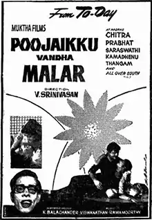 Poojaikku Vandha Malar (transl.The flower that came for the puja) is a 1965 Indian Tamil-language film produced and directed by Muktha Srinivasan, and written by K. Balachander. The film stars Gemini Ganesan, Nagesh, R. Muthuraman and Savithri. It was released on 12 March 1965 and became a commercial success.